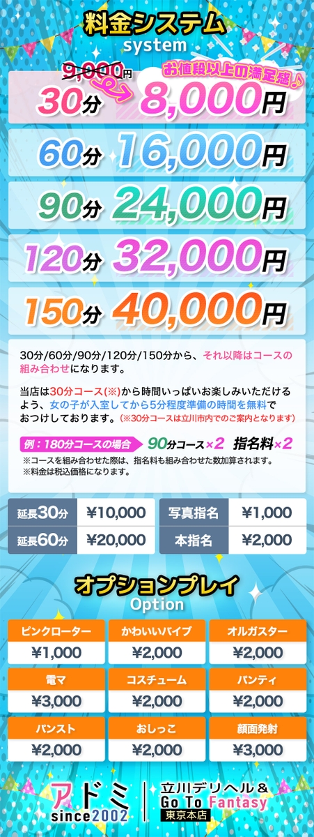 立川デリヘル【アドミsince2002立川デリヘル&Go To FANTASY東京本店】 メニュー